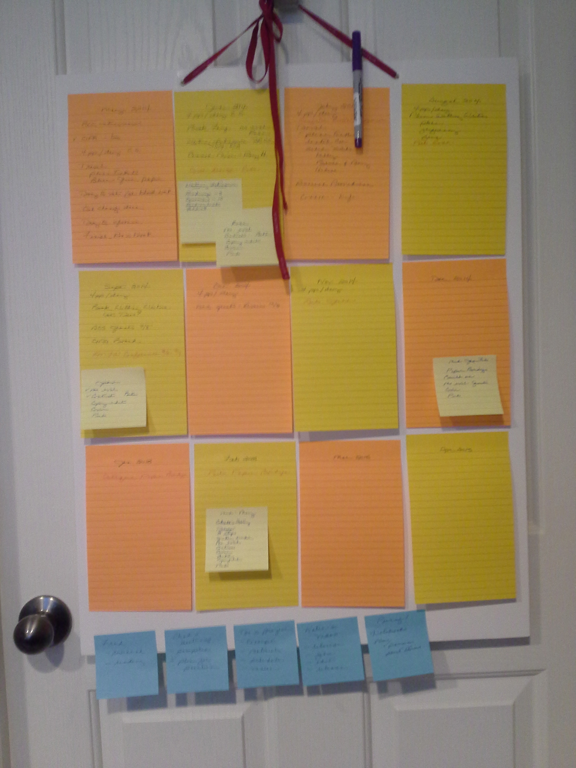 Even the words business plan give me hives. But I’ve just read most of an amazing book, which I plan to review on Goodreads when I finish it, and Pamela Fagan Hutchins (What Kind of Loser Indie Publishes? and can I be one, too?) has convinced me that I need better organization to get on with indie publishing, which I believe in. So I have redone my project board. I use a piece of foam board, in which I punched two holes and added a ribbon (red because it’s important) and hung it on a wreath hanger on the door to the storage closet adjacent to my office space. I’ve been using stickies to remind me of the my projects, but this method did not keep me moving as well as I might have. So I stripped off those stickies and put up a big one for each of the next twelve months. Smaller stickies remind me to anticipate three months in advance of when I hope–no, I plan–to publish the next book.The blue ones remind me that there are projects that don’t yet have a deadline or are ongoing.